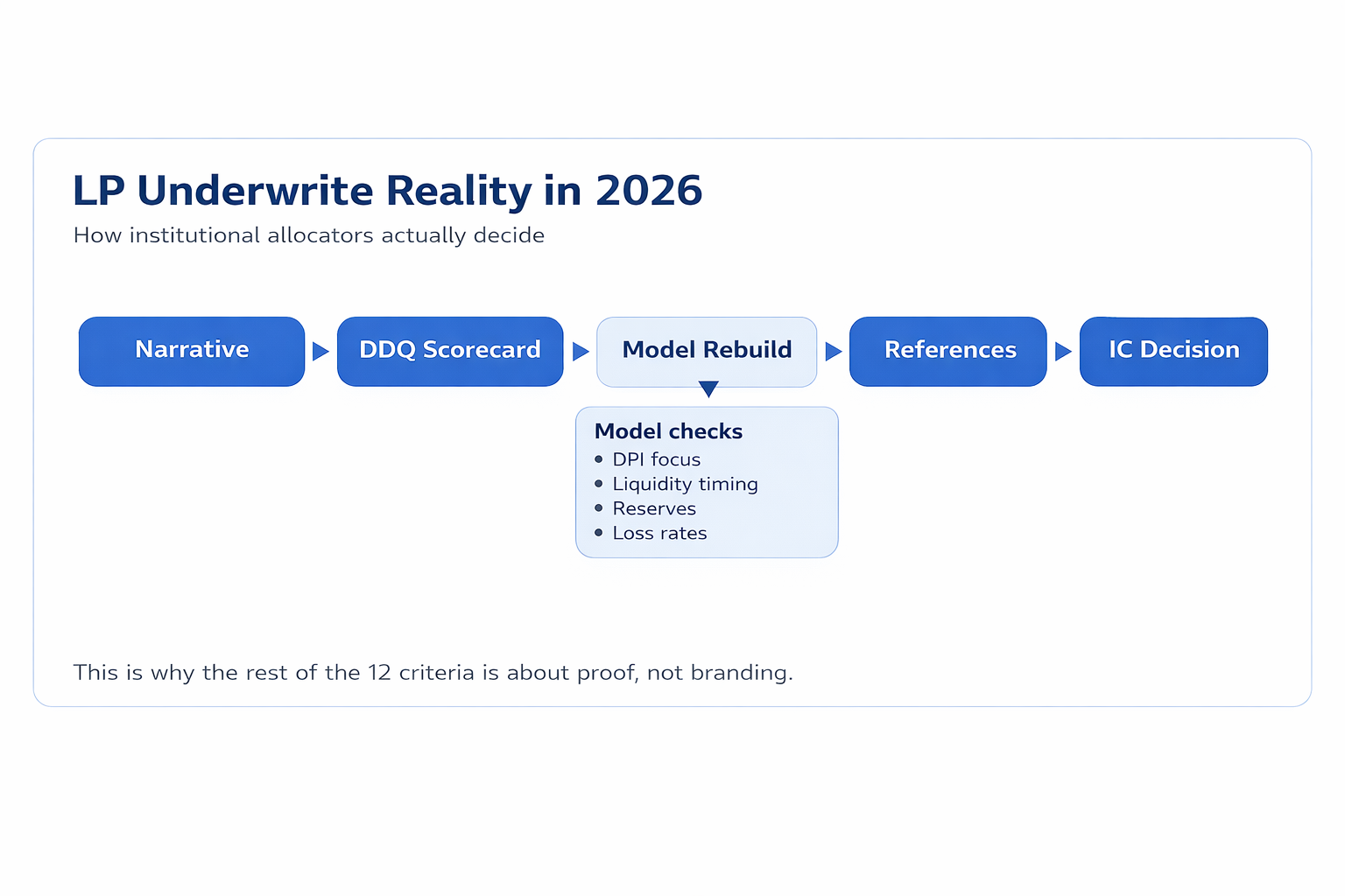 In this case, LPs do not fund any name or brand. They fund proof. Many institutional allocators now rely on structured ILPA-style questionnaires and internal scorecards when they underwrite emerging managers.