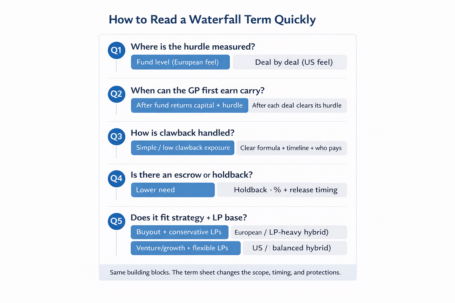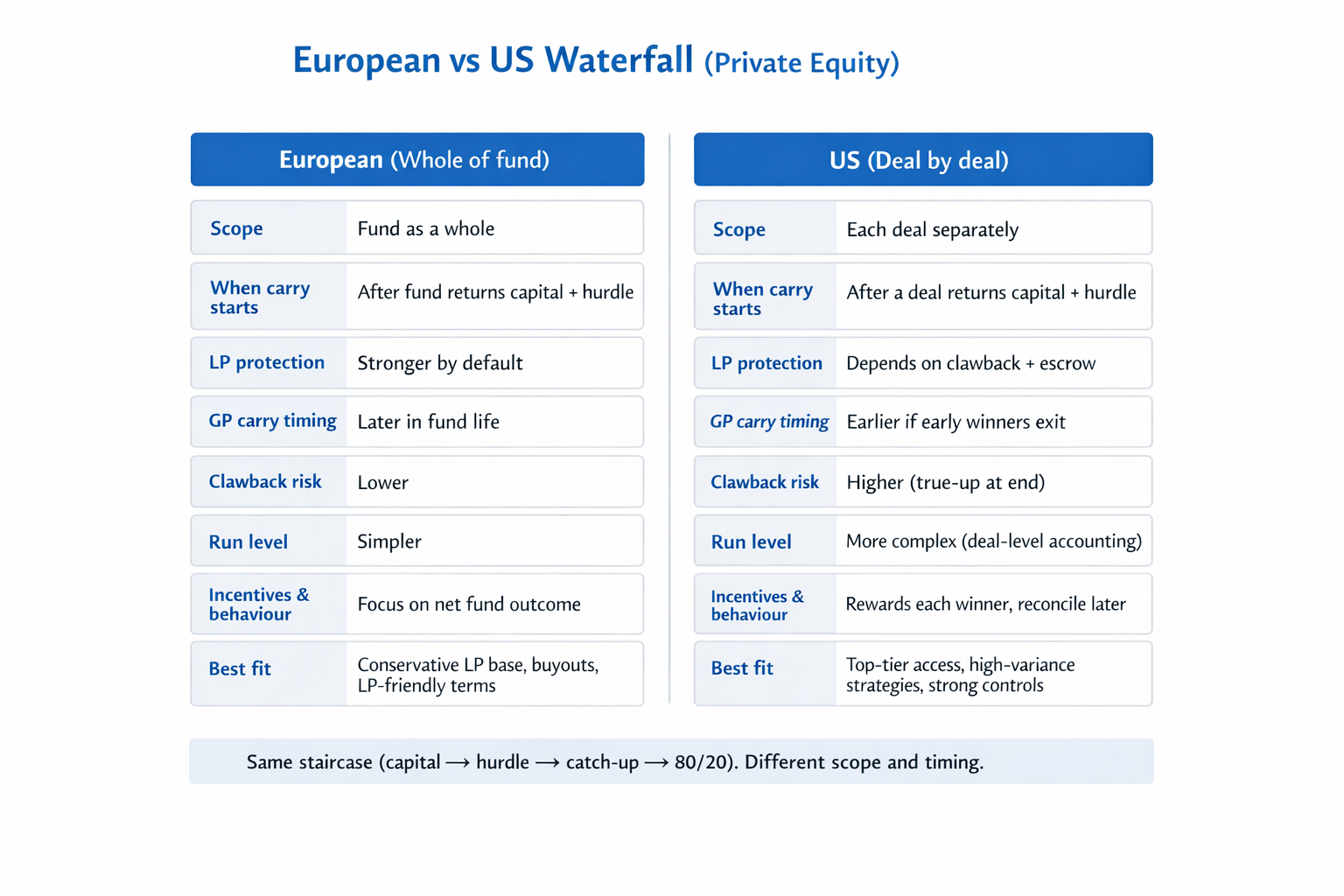 - European waterfall: “Fund first, carry later, lower clawback risk.”