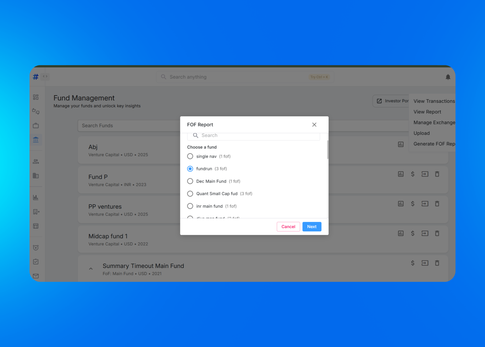 Fund of Funds (FOF) reporting now follows a simpler, more intuitive flow. You can select the right fund, apply a saved template and generate an accurate report in one sequence.